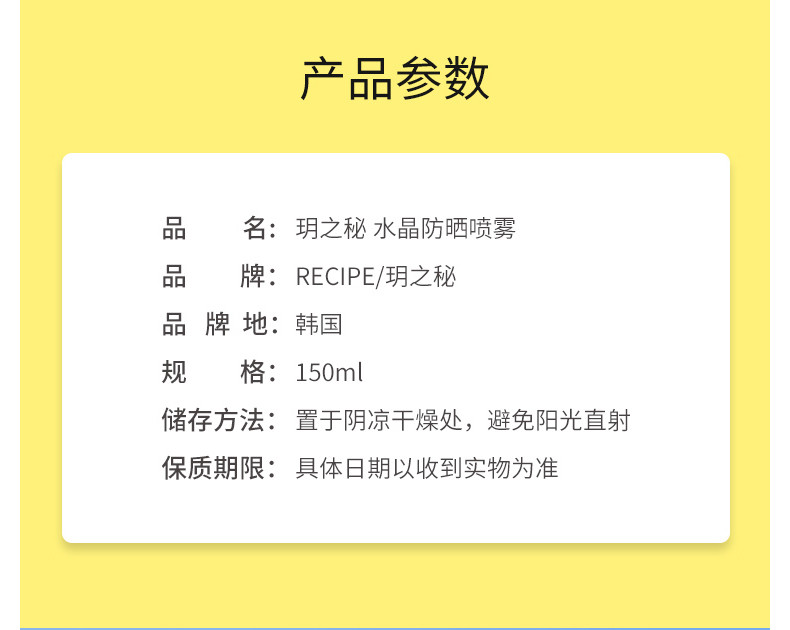【跨境】韩国 RE:CIPE 玥之秘 水晶防晒喷雾 SPF50 150ML