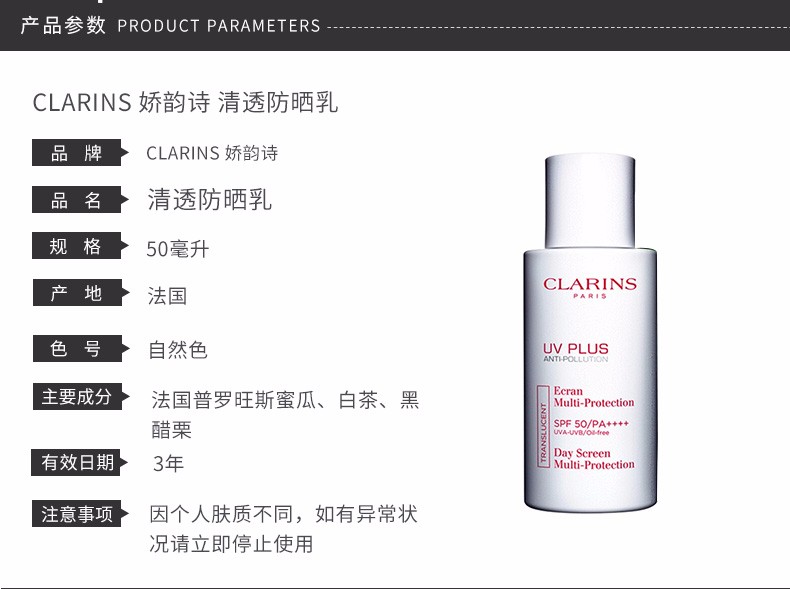 【跨境】法国 CLARINS 娇韵诗 抗污染透白防晒霜 SPF50 (透明色) 50ML